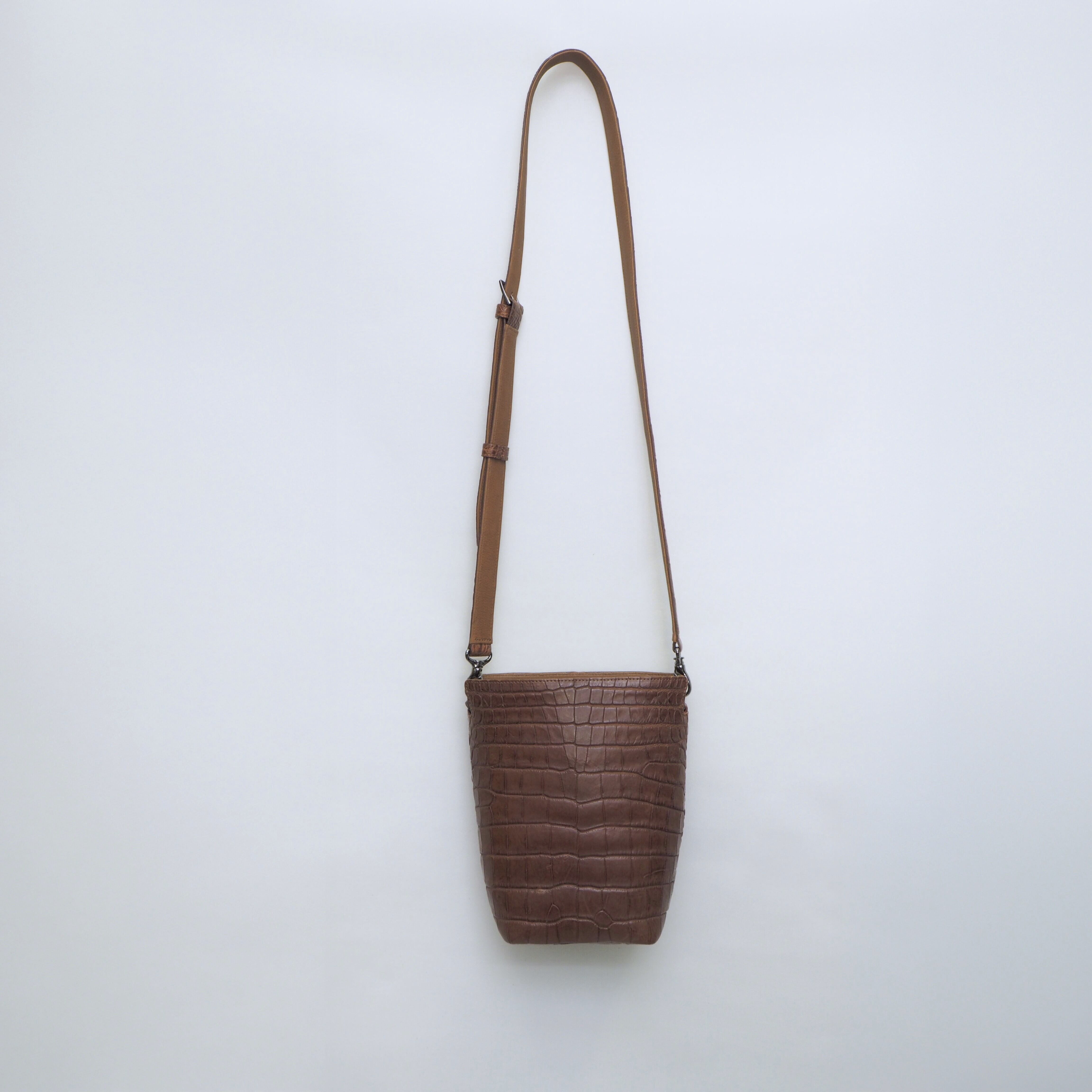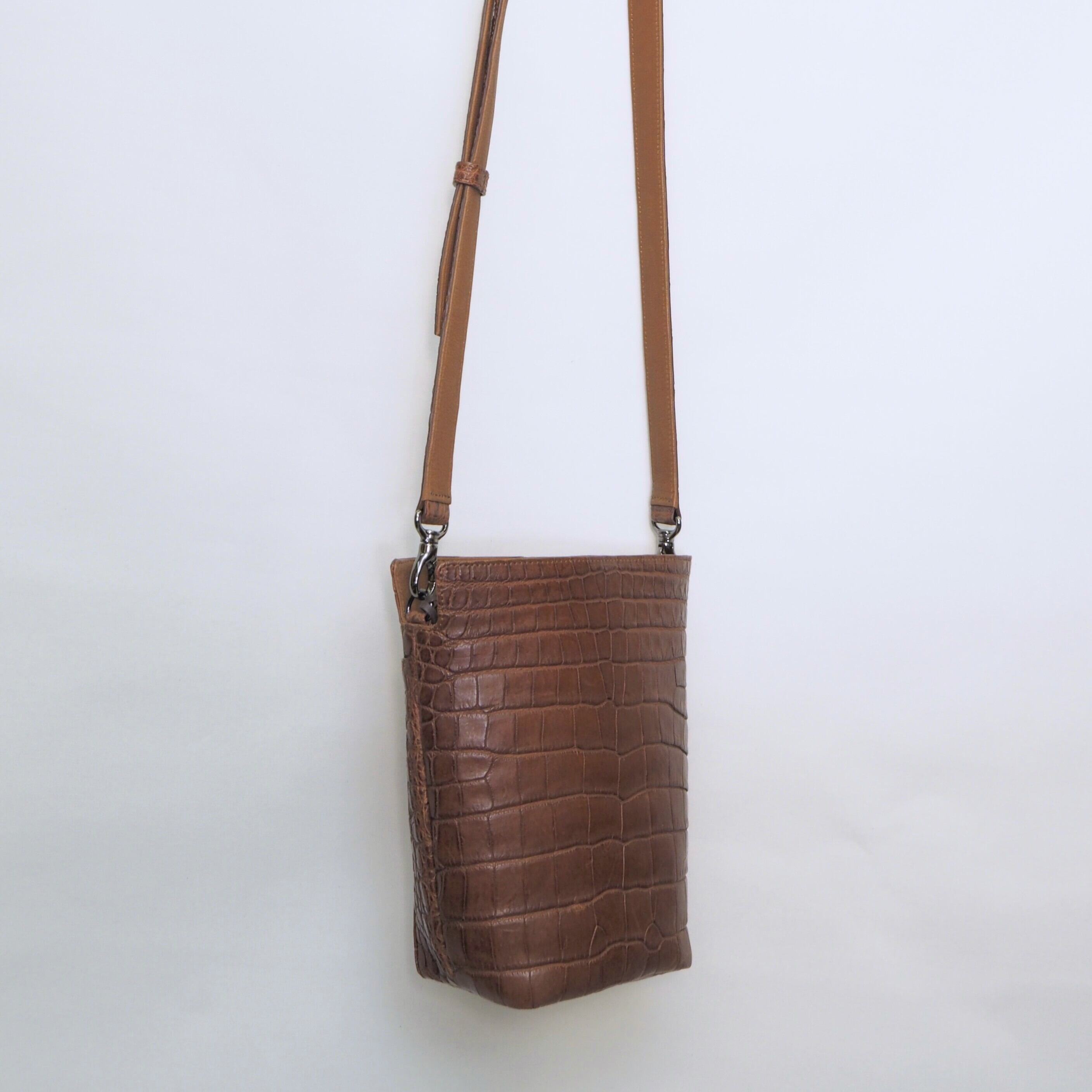 クロコダイルで仕立てた縦長のショルダーバッグ。 その名も “ポケット”。 大人の男性にこそ、まるで服のポケットの延長のように気軽に使ってほしい、そんな思いで名付けました。